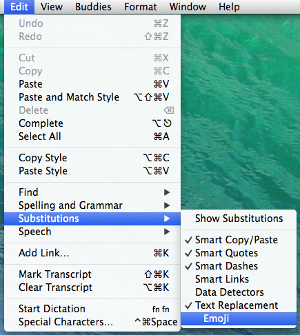 Personally, I prefer to send the actual text rather than an Emoji symbol, but I couldn't find anywhere in the app's preferences to turn it off. After a lot of searching, it turns out the answer is simple. Just click in the text field in Messages and deselect Edit → Substitutions → Emoji, and emoticons will no longer be replaced with Emoji symbols. You can also right click in the text field and deselect Substitutions → Emoji from the menu.