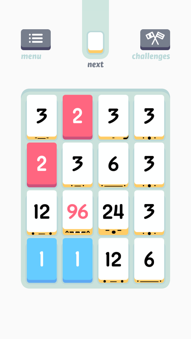 The popular new game on the App Store at the moment is Threes!. It looks sort of like a sliding number puzzle, but the concept is completely different. The idea is, starting with a 1 tile and a 2 tile, you match tiles together to form ever-increasing multiples of three.